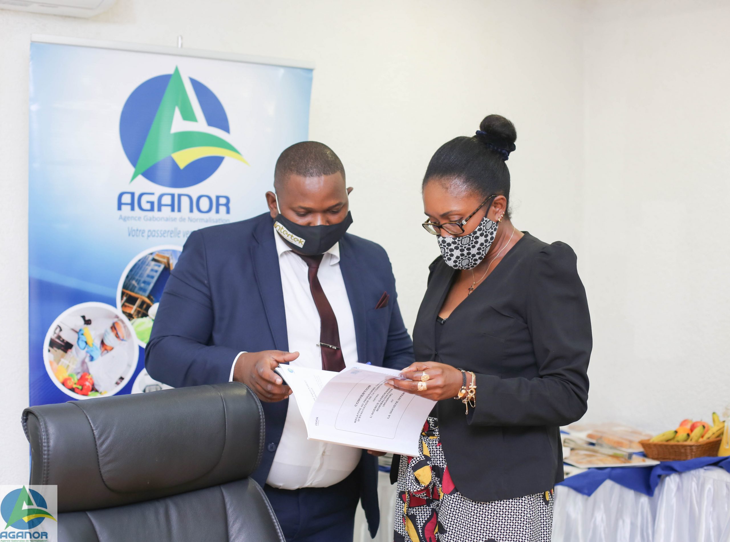La cérémonie de signature de la Convention s’est déroulée au sein des locaux de l’AGANOR entre M. Abdu Razzaq Guy KAMBOGO, Directeur Général de l’AGANOR et M. Josian Fabrice EYENE Représentant d’Intertek International.