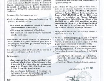 Le Directeur Général de l’Agence Gabonaise de Normalisation (AGANOR) informe toutes les parties prenantes de la normalisation que, conformément à la loi N°006/2014 du 28 août 2014 instituant le Système National de Normalisation, les projets de normes gabonaises ci-dessous, adoptés par les Comités Techniques de normalisation CT1 « Produits Alimentaires », CT2 « Bâtiment et Génie Civil »,…