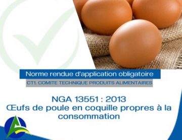 Jour 7 – norme 7 : NGA 13551 : 2013 Œufs de Poule en coquille propres à la consommation. La présente norme s’applique aux œufs de poule en coquille propre à la consommation humaine en l’état et à une utilisation dans l’industrie alimentaire et/ou non alimentaire. Les œufs doivent tous être issus de poules pondeuses…
