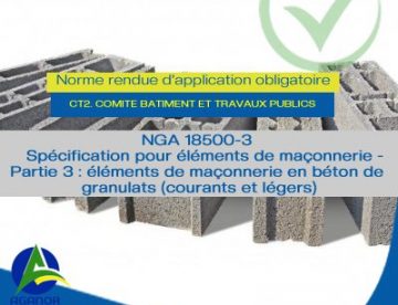 NGA 18500-3 : Spécification pour éléments de maçonnerie – partie 3 éléments de maçonnerie en béton de granulats (courants et légers). La NGA 18500-3 spécifie les caractéristiques et les exigences de performances des blocs en béton de granulats fabriqués à partir de granulats courants et légers ou une combinaison des deux, utilisés, exposés ou non,…