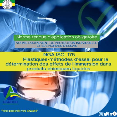 NGA ISO 175 : Plastiques-méthodes d’essai pour la détermination des effets de l’immersion dans des produits chimiques liquides.