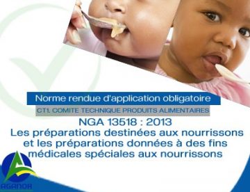 La présente norme est divisée en deux sections. La section A vise la préparation pour les nourrissons et la section B les préparations données à des fins médicales spéciales aux nourrissons. NGA 13518 : 2013 / section A : vise les préparations pour nourrissons présentées sous forme de liquide ou en poudre et destinées à…