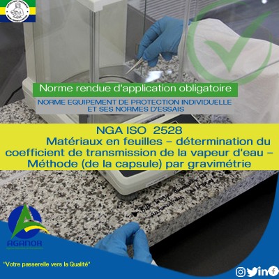 La NGA ISO 2528 prescrit une méthode pour la détermination du coefficient de transmission de la vapeur d’eau (souvent appelé, à tort, «perméabilité») des produits en feuilles. En général, l’utilisation de la présente méthode n’est pas recommandée si le coefficient de transmission attendu est inférieur à 1 g/(M2 -d) ou pour des matériaux d’une épaisseur supérieure à 3 mm. Dans de tels cas, la méthode prescrite dans l’ISO 9932 est mieux adaptée.