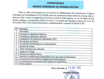 Dans le cadre du lancement de son activité de référencement des fournisseurs, l’Agence Gabonaise de Normalisation (L’AGANOR) invite les opérateurs exerçant dans les secteurs cités en pièce jointe à bien vouloir se rapprocher du service accueil de son agence, en vue du dépôt de leur dossier juridique et proposition d’offre de service.