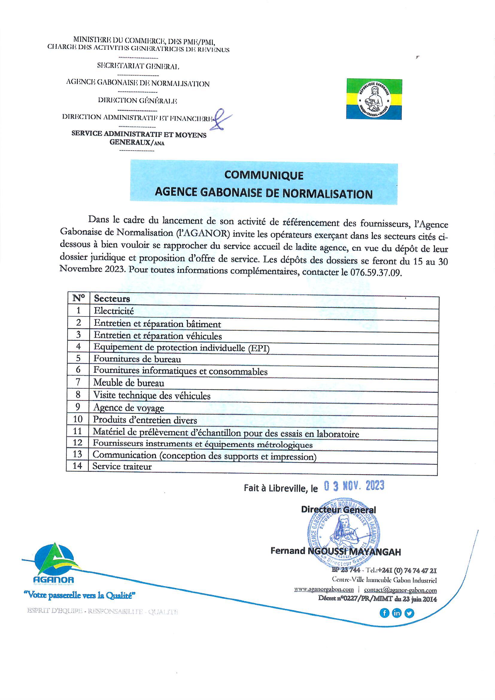 Dans le cadre du lancement de son activité de référencement des fournisseurs, l’Agence Gabonaise de Normalisation (L’AGANOR) invite les opérateurs exerçant dans les secteurs cités en pièce jointe à bien vouloir se rapprocher du service accueil de son agence, en vue du dépôt de leur dossier juridique et proposition d’offre de service.